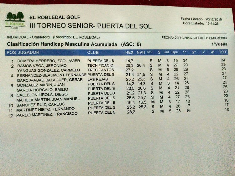 El 3º torneo del IV Circuito Senior del Club se tuvo lugar el martes 20 de diciembre de 2016 en el campo de El Robledal (Villalbilla, Madrid). Las salidas se efectuaron a semi-tiro a las 10,00 horas. La comida se celebró en uno de los comedores de la casa club.